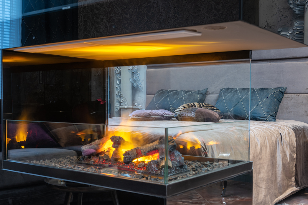Номер состоит из спальни с большой двуспальной кроватью размера «King Size» (180*200 см), ванной комнаты с душем и прекрасной зоны отдыха с камином.